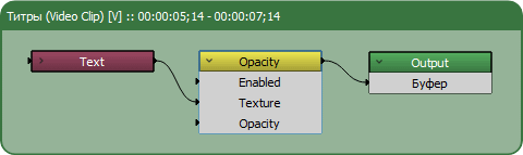 • Opacity. Очень востребованный параметр, чтобы его использовать в композиции, особенно в анимации. Но его не вытащишь в орбиту своего внимания без Редактора нод. Почему-то. Ну ладно. Например, по кнопке вы добавили текст (объект Титры). Хотите, чтобы он плавно возникал и по прошествии нескольких секунд плавно исчезал. После добавления его на таймлайн выше всех видеодорожек выделите его инструментом . Откройте Редактор нод. Вставьте ноду Opacity (кнопка [+] > Фильтр > Opacity). С ноды Text заведите связь с параметром Texture ноды Opacity и Opacity соедините с параметром Буфер ноды Output.