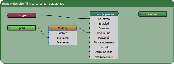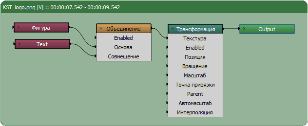 • Синхронизировать анимацию двух объектов. Например, надо Текст с подложкой в виде Фигуры, одинаковым образом передвигать по экрану. Можно, конечно, и тому и другому объекту создать одинаковый набор ключевых кадров, но это не наш подход, мы должны управлять анимацией из одного места, а не из двух. Итак, создаем первый объект, например Фигуру. Открываем его в редакторе нод. Добавляем ноды Текст, Объединение и Трансформация. Соединяем все ноды как показано на скриншоте: